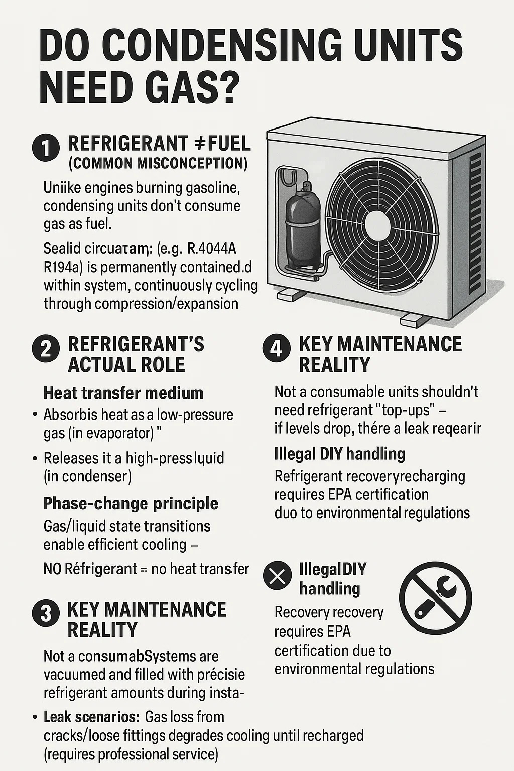 Ei, tiivistävät yksiköt Itse eivät tarvitse "kaasua" - mutta heidän jäähdytyspiiri vaatii ehdottomasti kylmäainekaasua toimimaan. Tässä on kriittinen erittely: