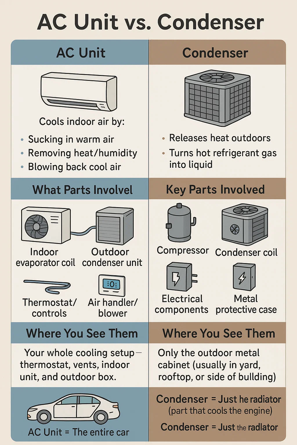Tässä on selkeä ero ilmastointilaitteen (AC-yksikön) ja a lauhdutin :